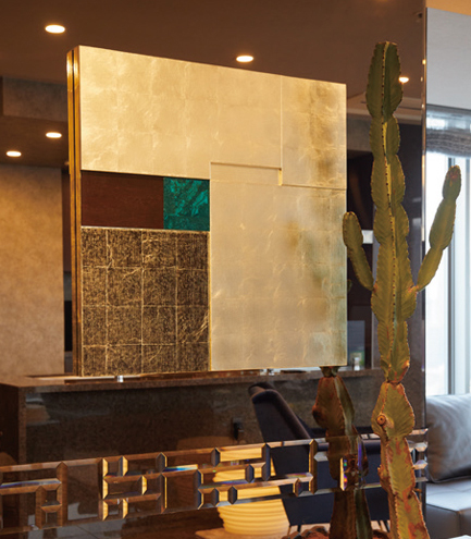 - 飾り棚のミラーには小口から光を取り込むとデザインした模様と影がアートのように浮かび上がる演出にしていて、夜になると雰囲気がガラリと変わります。 お部屋の中央に設置したブルーのスエードのパーソナルチェアに腰掛けて、窓に広がる東京の景色を眺めるご主人様の姿はドラマのワンシーンのようです。