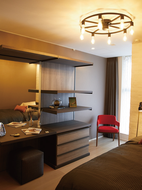 - また、寝室にも個性的なアイテムが光ります。ご主人様の寝室にはオブジェのようなドロワーユニット、奥様の寝室には真っ赤なチェアと、それぞれのお気に入りの家具をアクセントに、壁面やカーテンなどはシックにまとめ、落ち着いた空間に仕上げました。