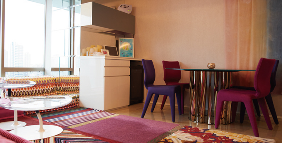 - メインのソファはイタリアンファッションブランドMissoniの張地をRoche Boboisのソファに使用した特注デザイン。